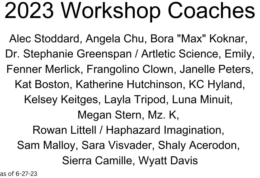 2023 Workshop Coaches Alec Stoddard Angela Chu Bora “Max” Koknar Dr. Stephanie Greenspan / Artletic Science Emily Fenner Merlick Frangolino Clown Janelle Peters Kat Boston Katherine Hutchinson KC Hyland Kelsey Keitges Layla Tr… (Instagram Post (Square)) – 1