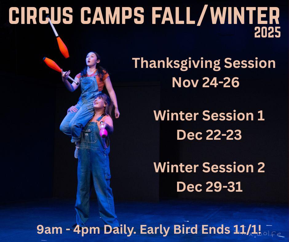Regular Circus Classes take a break during Winter Break Camps.  The WINTER/SPRING Session begins Monday, Jan 5, 2026.  Enrollment begins after Dec 1, 2025.  Spring Break 2026 Circo Day Camps?  Dates to be Announced Soon.