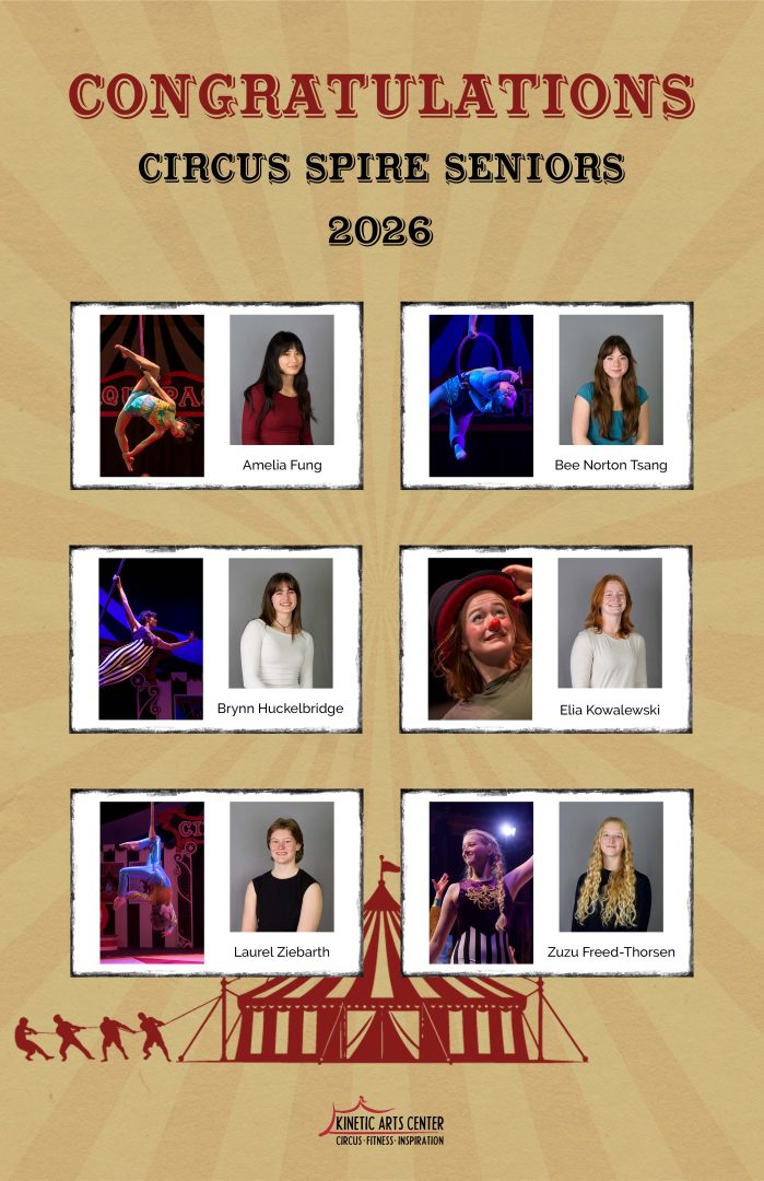 Who is the Circus Spire Youth Troupe? Kinetic Arts Center’s Circus Spire Youth Troupe is a group of 20 highly trained circus students ages 13 – 18. These performers take their training very seriously and together with their team of professional circus coaches are training at a pre-professional level 3 – 7 days a week (depending on the season). Each year they bring their skills to a unique, month-long circus production with acts in aerial arts, juggling, acrobatics and clown. Their training can take them to the next level of circus professional as a performer, coach, choreographer or advanced student of circus arts. For more information about the program, visit here.