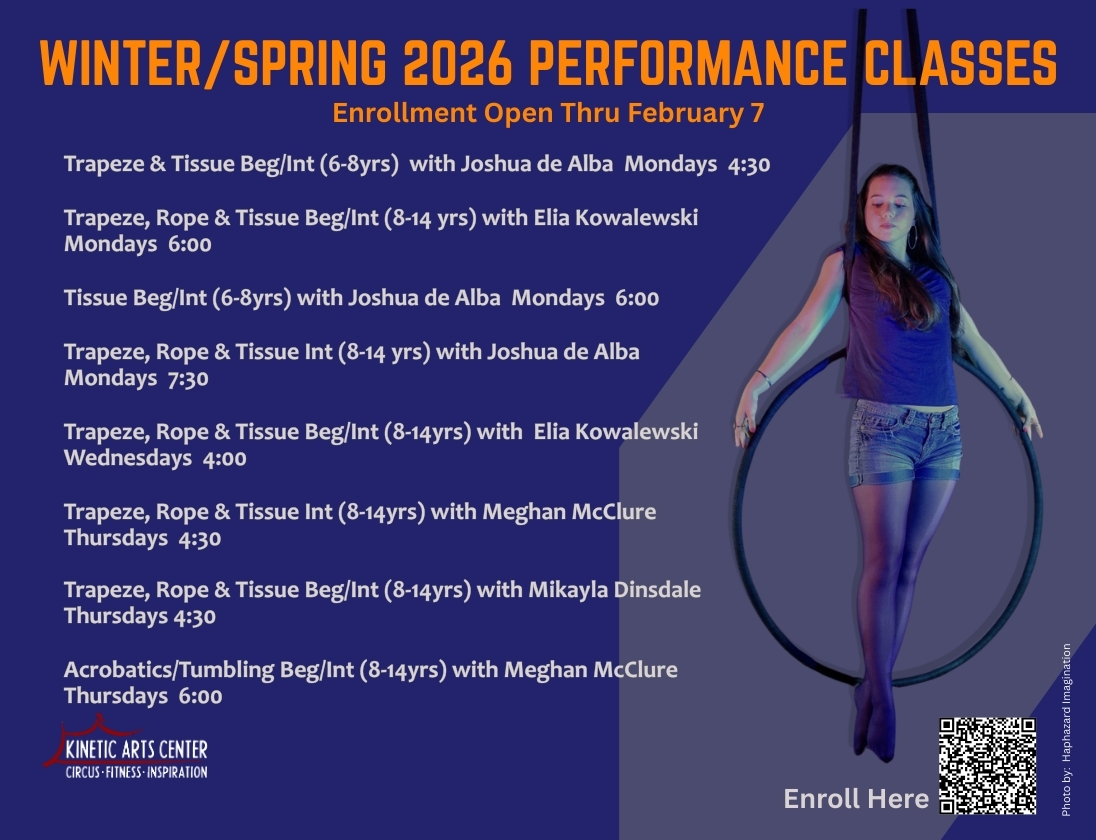 The Winter / Spring 2026 program culminates with a Show Day on Sunday, May 17, 2026 (2 shows), with a Mandatory Tech Rehearsal on May 16, when we bring all the Performance Classes together into one big production. Lights, sound, costumes, and makeup fly freely in Performance Classes. Open Enrollment for Performance Classes ends January 29, 2026. Click here to see a current list of offerings and to enroll now.
