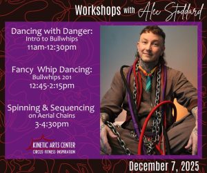 Kinetic Arts Center accepts workshop proposals year-round from resident and visiting teaching artists. Please reach out to Shaly@KineticArtsCenter.com if you want to pitch a workshop idea. We strive to produce workshops that speak to everybody at every skill level. Perhaps you need a little inspiration to refine an act you’ve been working on FOREVER. Or, maybe you have been trying to summon the courage to register for one of our classes but you have felt a bit uncertain. Whether beginner or professional, you will find an enriching circus experience at Kinetic Arts Center!